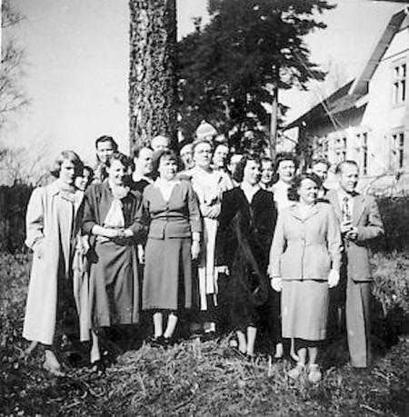 Kuvassa oikealla kuoronjohtaja Esko Karvinen, hänen edessään Aili Sievinen (o.s. Kuorikoski) ja tämän vieressä tummassa asussa Vappu Heinämäki (o.s. Sievinen), heidän välissään Sirkka Nieminen (o.s. Kallio). Kookas nainen keskellä on Hilma Järvinen (o.s. Nordström), hänen takana pilkistää Esko Helle. Kolmas vasemmalta on Toini Helle, 5. vasemmalta Helga Långström, sitten Irja Kuorikoski (myöh. Rantanen), heidän takanaan Toivo Valo. Sirkka Niemisen ja Vappu Heinämäen välissä ilmeisesti Risto Wallden. Kuvan omistaa Vappu Heinämäki.